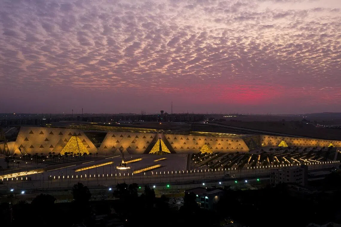 The Grand Egyptian Museum at night on the Giza Plateau.