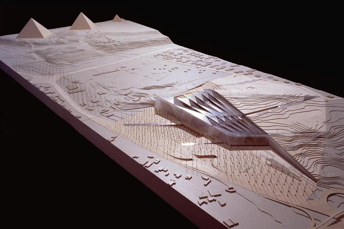 An architectural model of the Grand Egyptian Museum, set between Cairo and the Giza Pyramids.