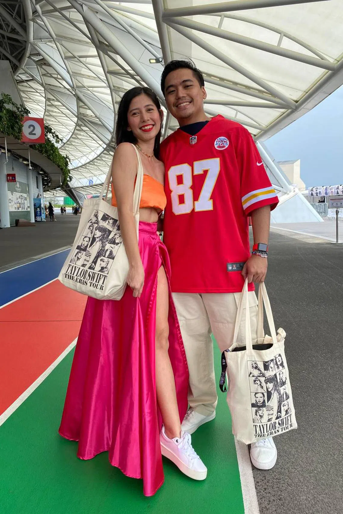 Filipino tourists Andrea Smile Carvajal (left) and Gabriel Eric Villanueva dressed as Taylor Swift and American football tight end Travis Kelce.