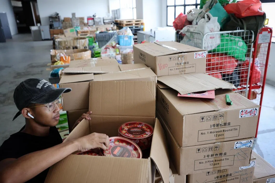 A volunteer sorting through donated biscuits at The Food Bank Singapore’s warehouse in Pandan Loop.