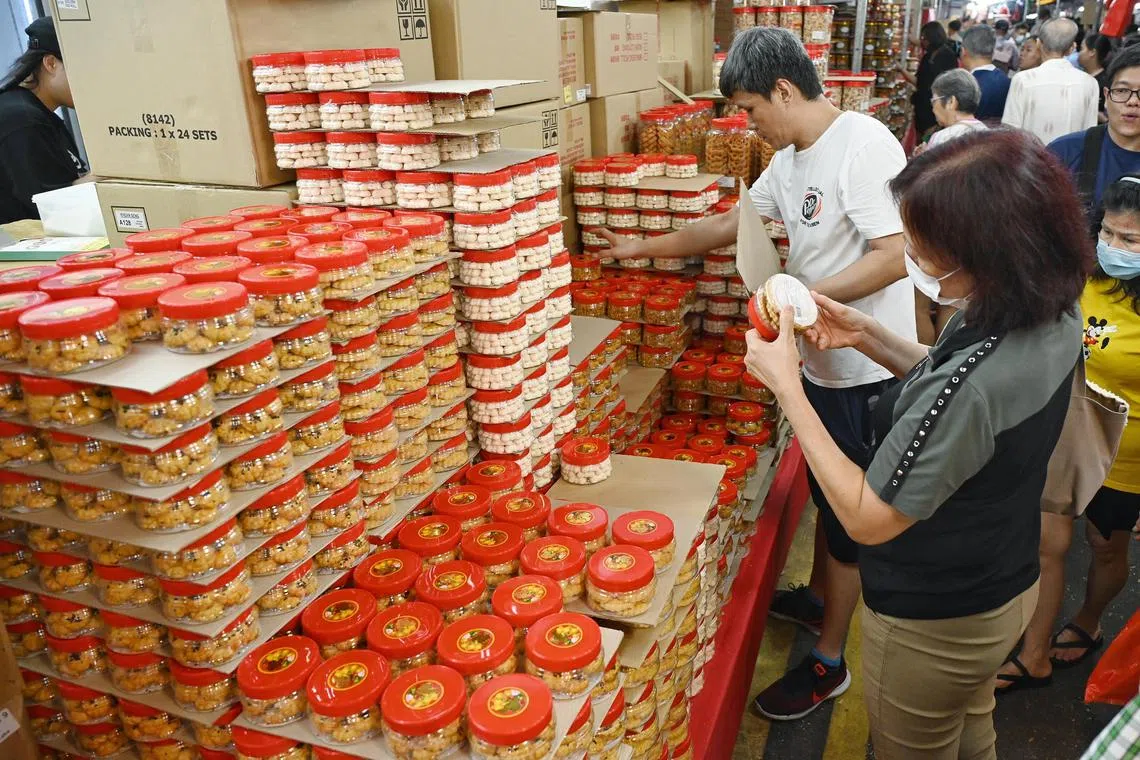 On the second-last day of the Chinatown Bazaar on Feb 8, stacks of pineapple tarts, cashew cookies, egg rolls and many other biscuits remain.