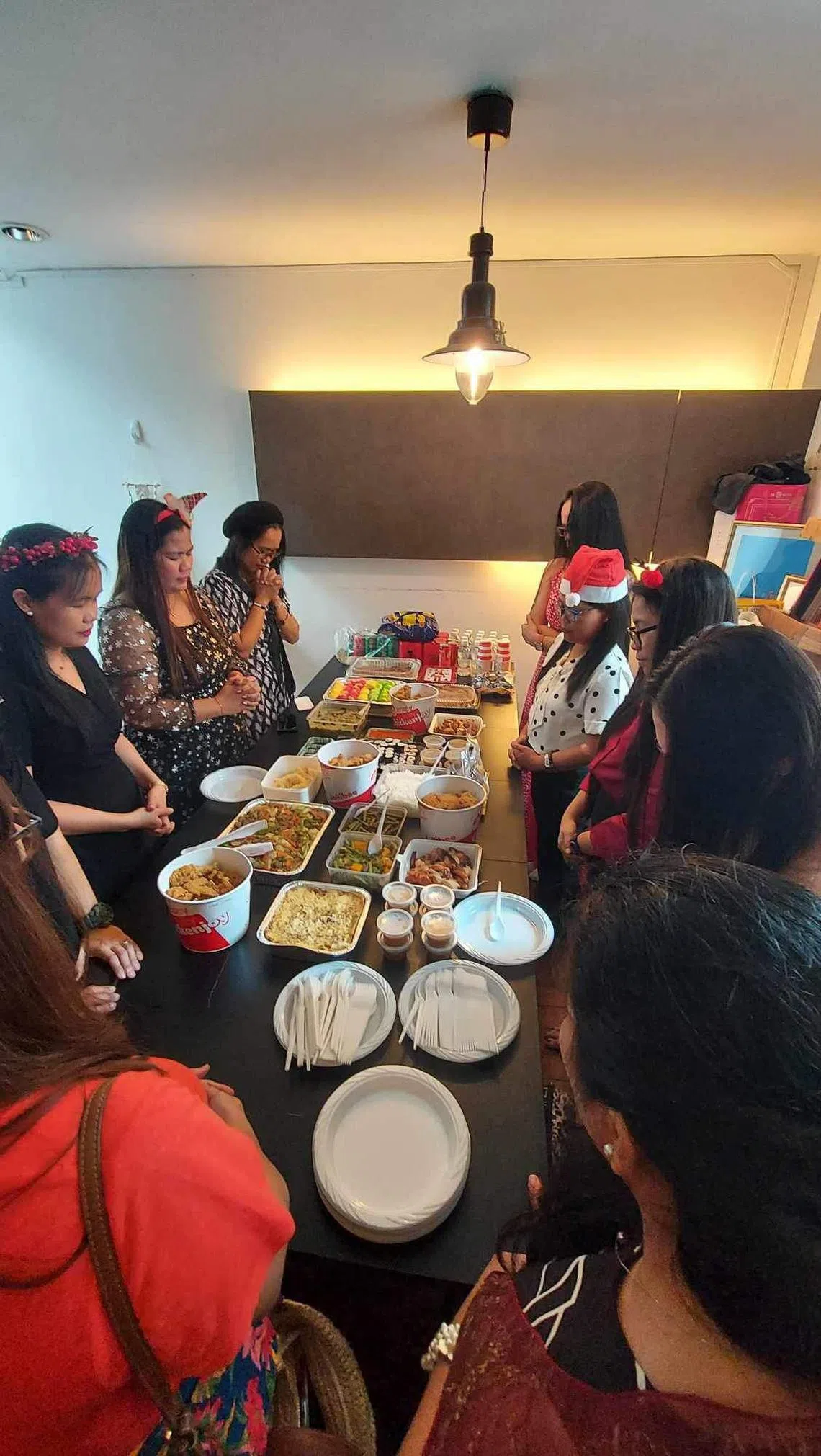 Ms Janelyn Dupingay (first from left in black dress) and her friends from the Migrant Writers of Singapore celebrating Christmas with a classic Filipino spread.