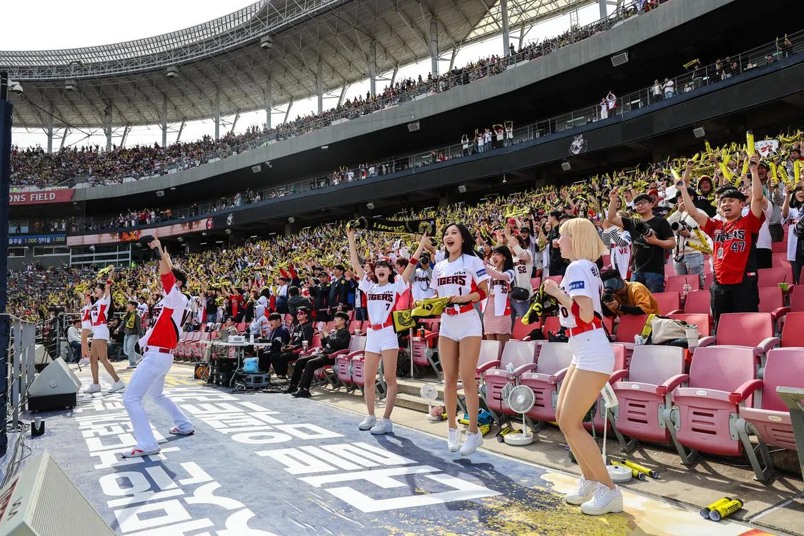 In an undated image provided by Kia Tigers, cheerleaders for the Kia Tigers, a top team in the Korea Baseball Organization, performing at a match.