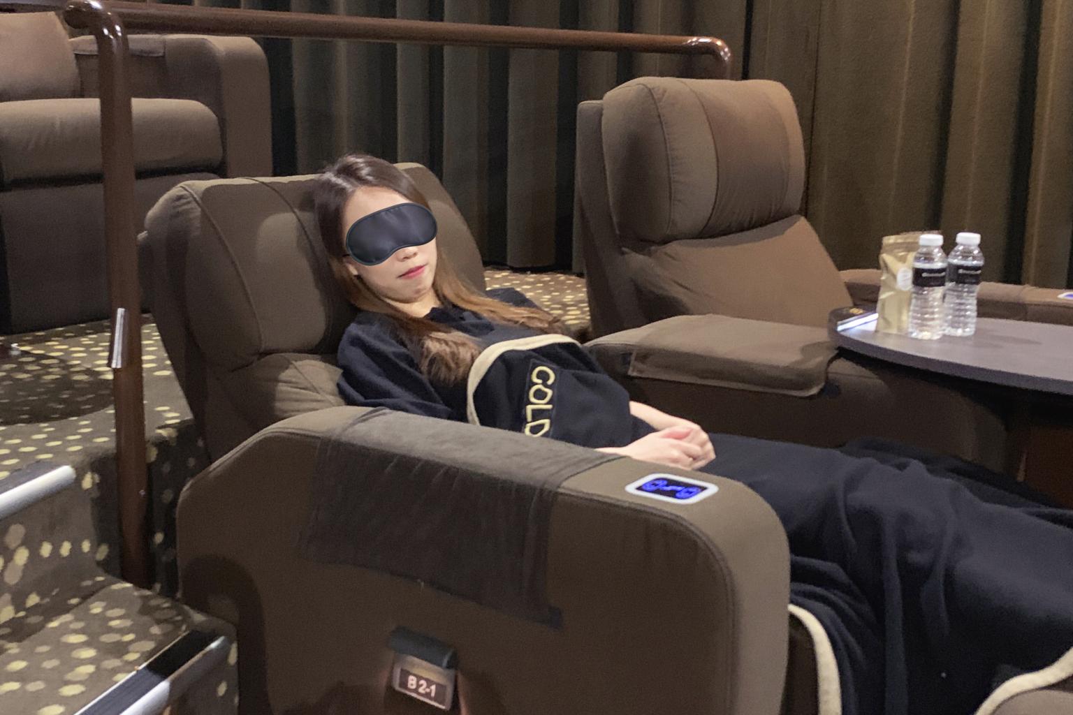 The hall is silent and close to pitch black, save for reedy blue lights illuminating seat numbers and controls. The extremely plush seats recline almost horizontally. Blankets are provided - they feel a bit thin but smell laundry-fresh. Bring a sweater for additional warmth, and a pair of earplugs in case you wind up next to a snoring neighbour.