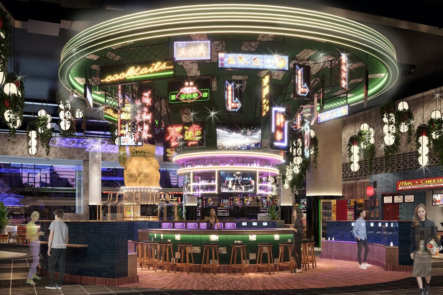Guests can go for drinks at the Famous Foods Center Bar, which will feature a self-pour and automated beer system offering a rotation of beers, cocktails and wines from around the world. Or they can chill at Here Kitty Kitty Vice Den, a tucked-away speakeasy.