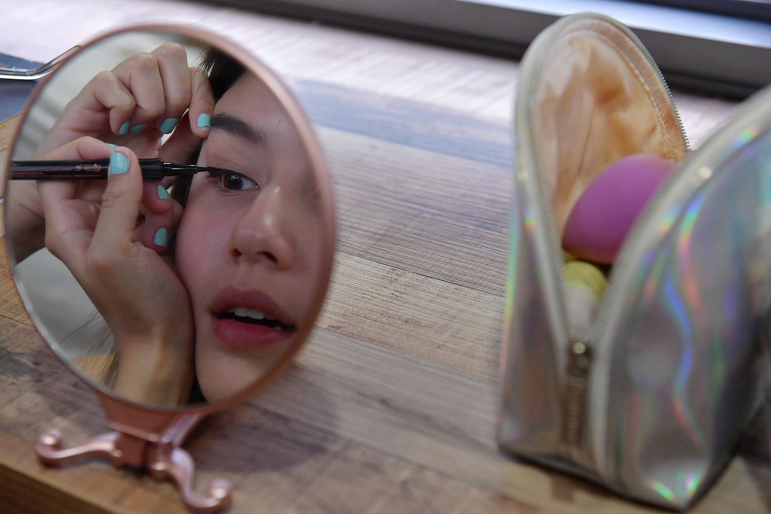 Sharpe, back in her bedroom, spends about 15 minutes putting on mascara, light foundation, concealer and curling her eyelashes.