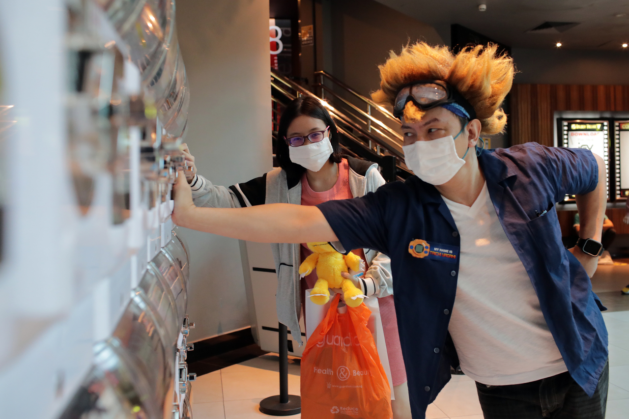 Reporter John Lui dressed as Taichi Yagami takes a photo with a fan at Plaza Singapura, on July 14, 2020.