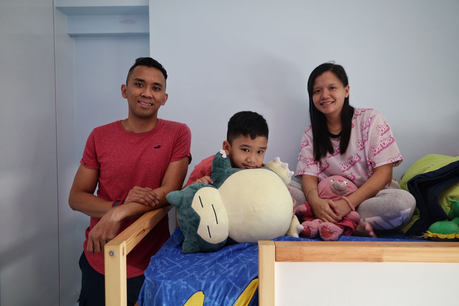 Mr Saiful Nor Mirza Abdul Samat, with his seven-year-old son Saiful Iman Saiful Nor Mirza, a Henry Park Primary 1 pupil, and wife Bernice Ng at their home, on Jan 9, 2020.