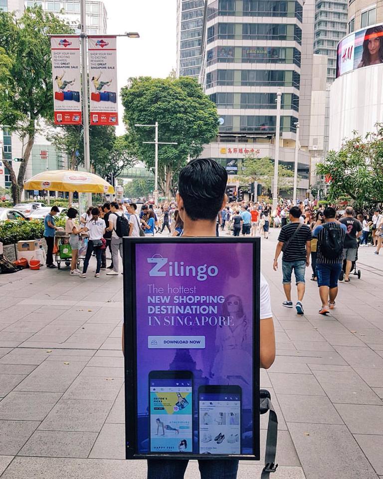 A man wearing a sign promoting the Zilingo app on Orchard Road, Singapore.