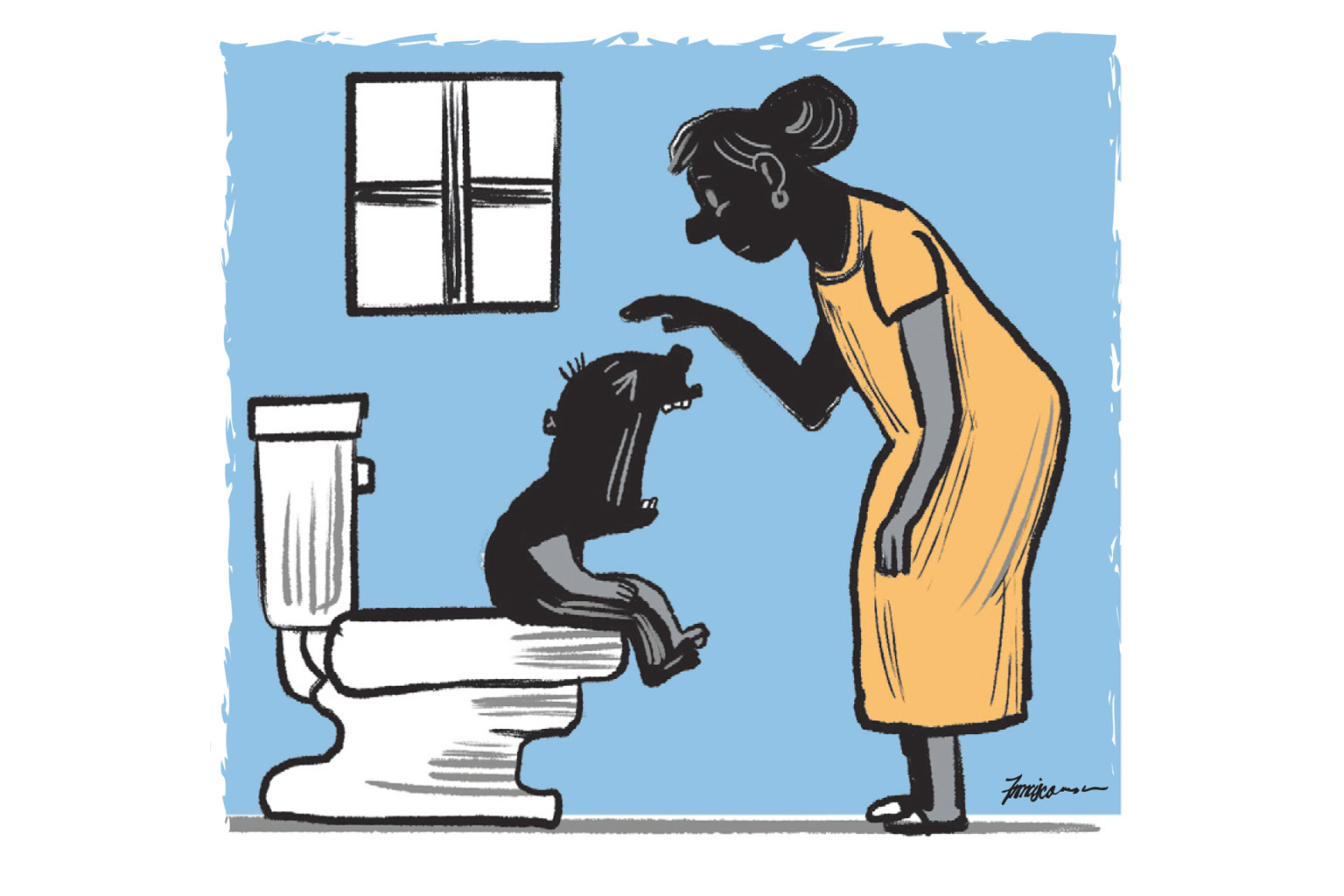 At last the mother lets the boy off the toilet. The father returns and sheepishly apologises.