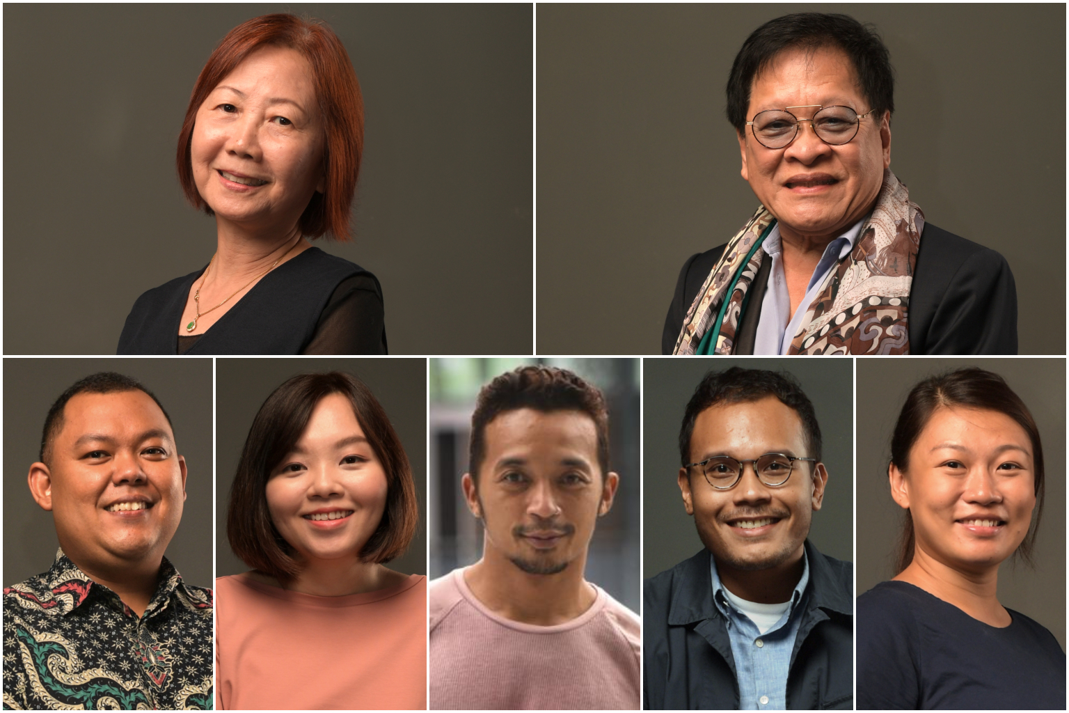 Clockwise from top left: Dance choreographer Low Mei Yoke, jazz musician Louis Soliano, sound designer Lim Ting Li, visual artist Hilmi Johandi, dancer and choreographer Mohamad Sufri Juwahir, playwright Faith Ng, and conductor and music director Zulkifli Mohamed Amin.