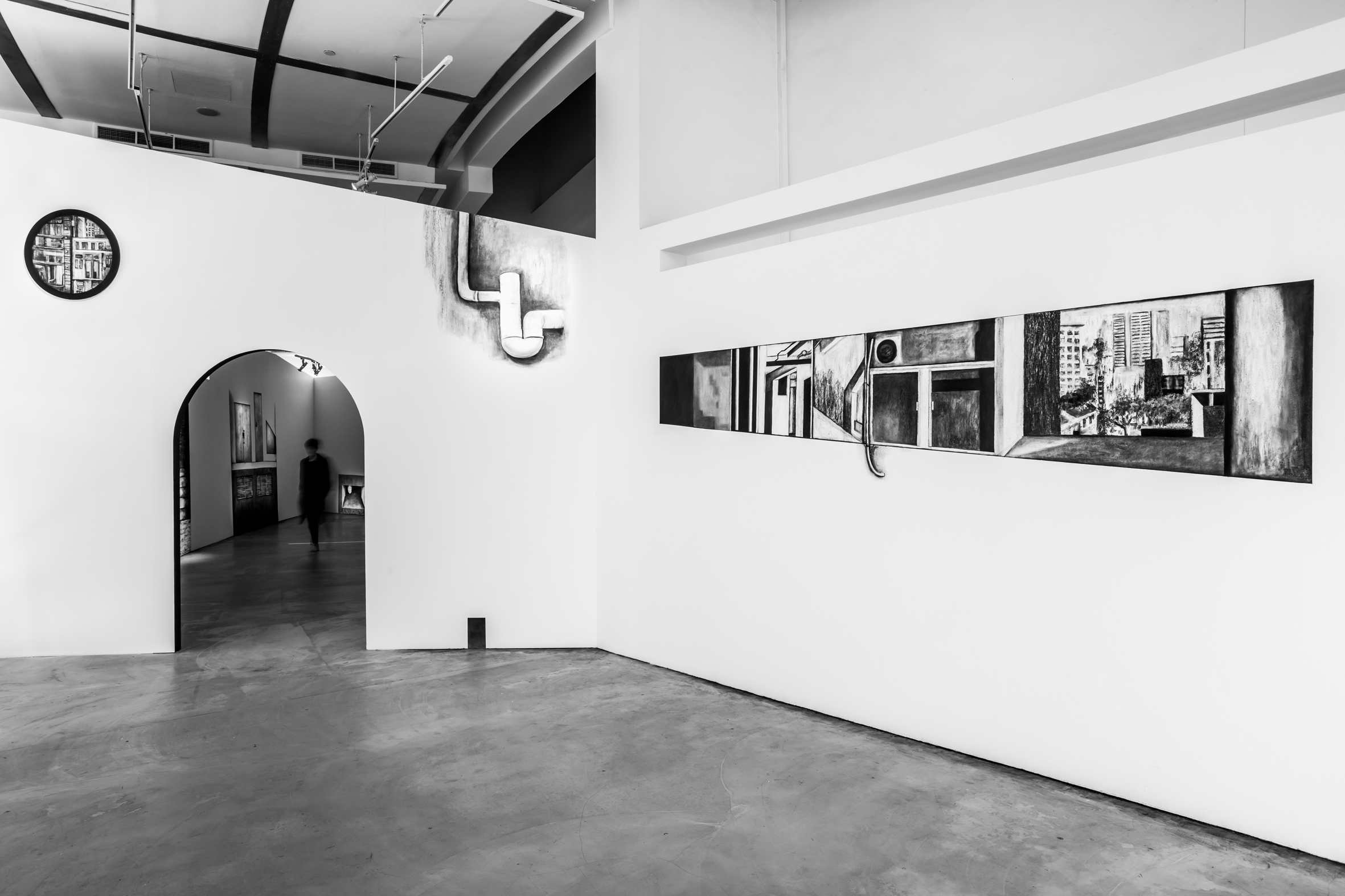 Tang demarcates spaces in the rooms using artificial lighting within the gallery and natural light that seeps through Jendela's louvred windows, along with charcoal drawings on the walls.
