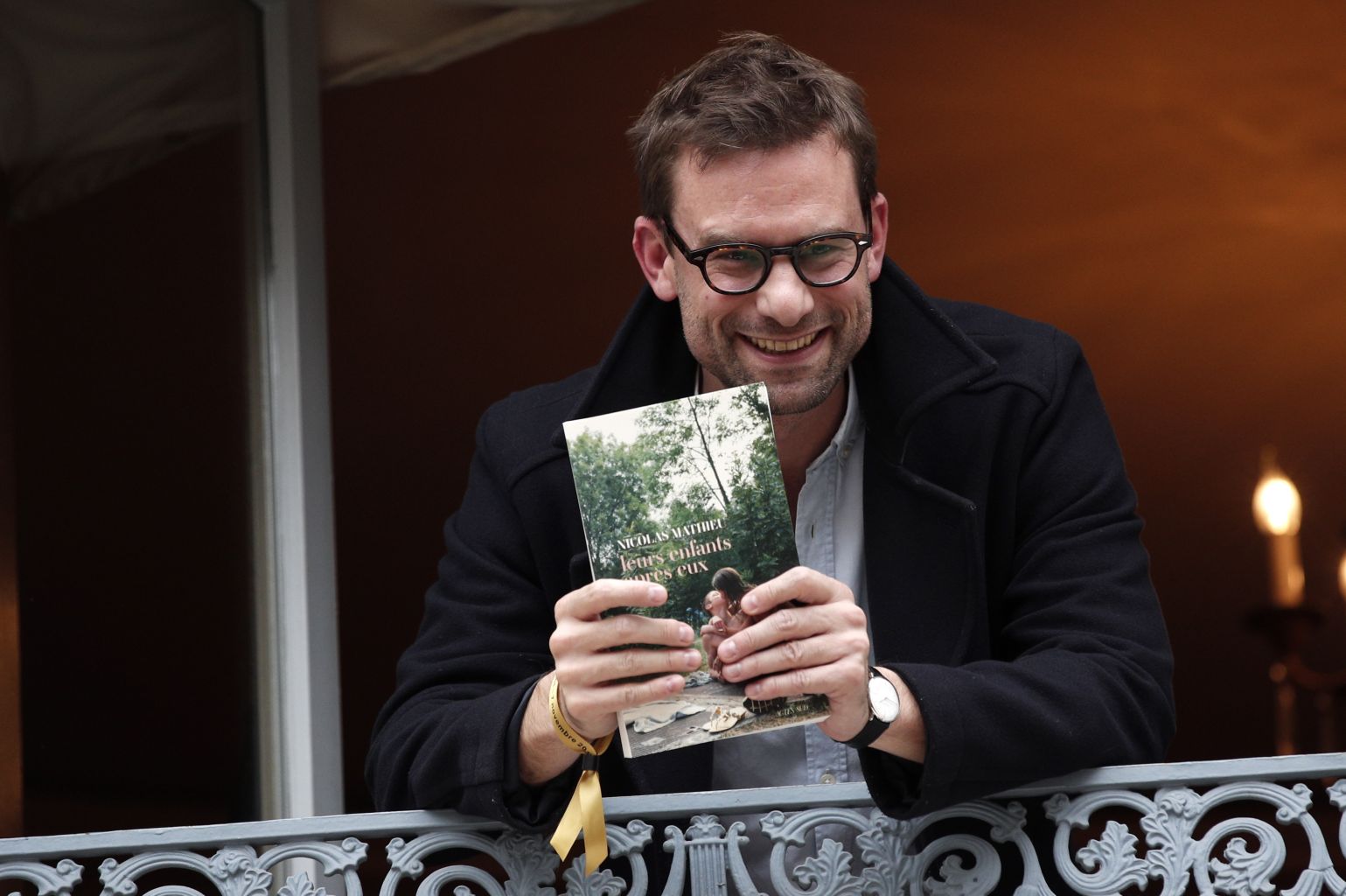 Nicolas Mathieu poses for photographs at the window of the Drouant restaurant after his win.