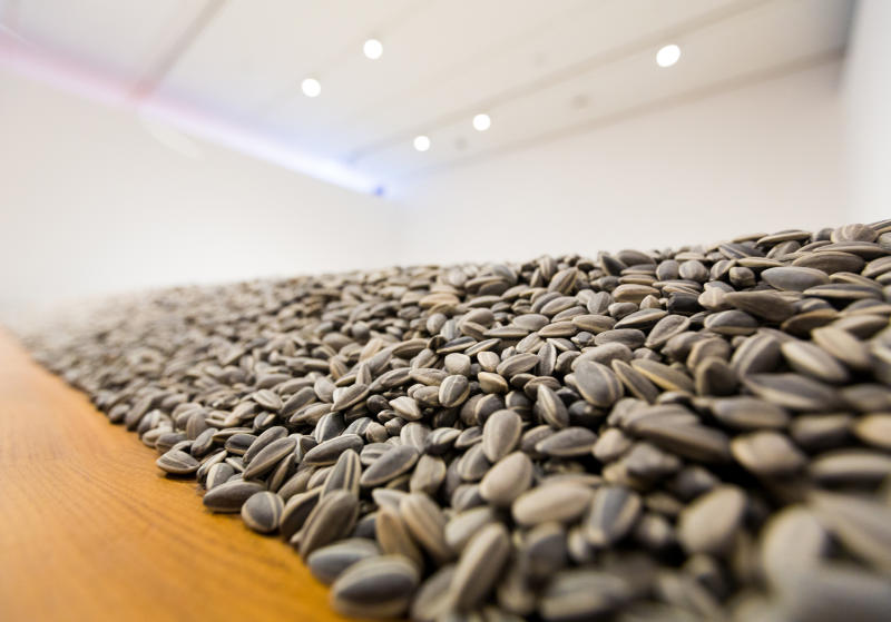 Repetition was a key feature of Minimalist works and thousands of porcelain beads, shaped and sized to look like sunflower seeds, make up this installation by influential Chinese artist Ai Weiwei. Though the seeds look similar, each is unique and handcrafted by artisans in Jingdezhen, China. Through this installation, Ai challenges the popular idea that "Made in China" is synonymous with cheap mass production.