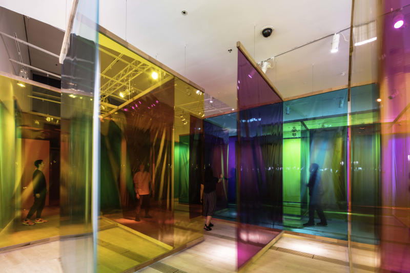 Danish-Icelandic artist Olafur Eliasson creates an immersive, multi-coloured maze of translucent plastic sheets, with spotlights providing illumination. As viewers walk through the installation, they experience a variety of colours at different points, depending on the overlay of coloured sheets.