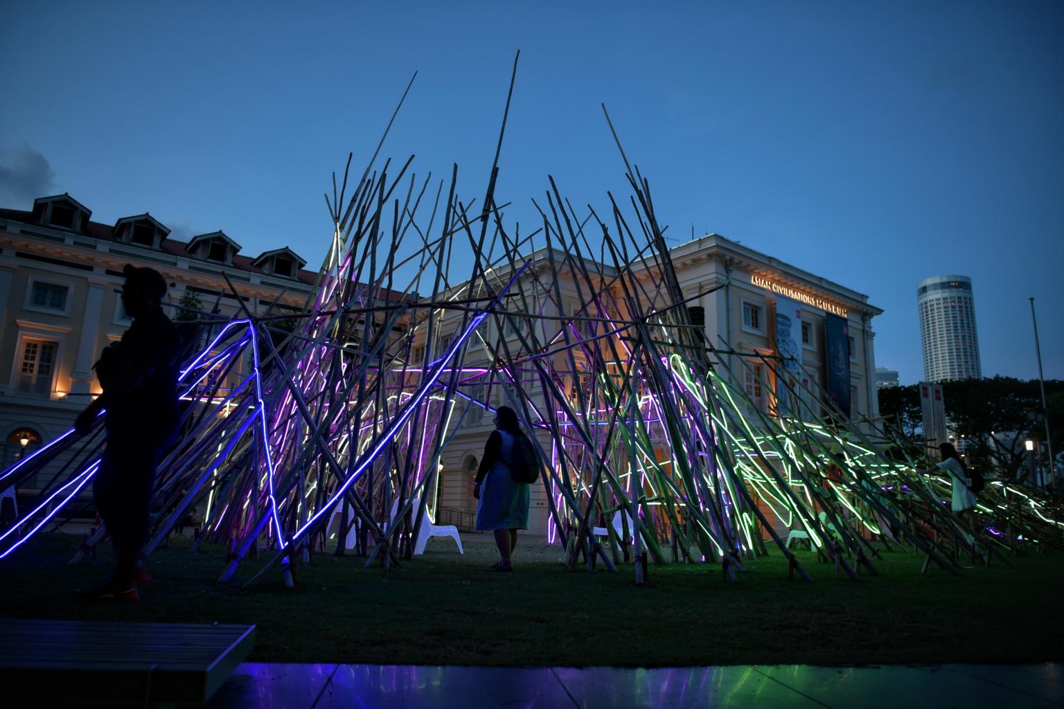 Next door, on the lawn of the Asian Civilisations Museum, artist and designer Sebastian Chun has created Sticks, an installation of roughly 500 poles of bacau wood or mangrove wood, hammered into a tepee-like shape.