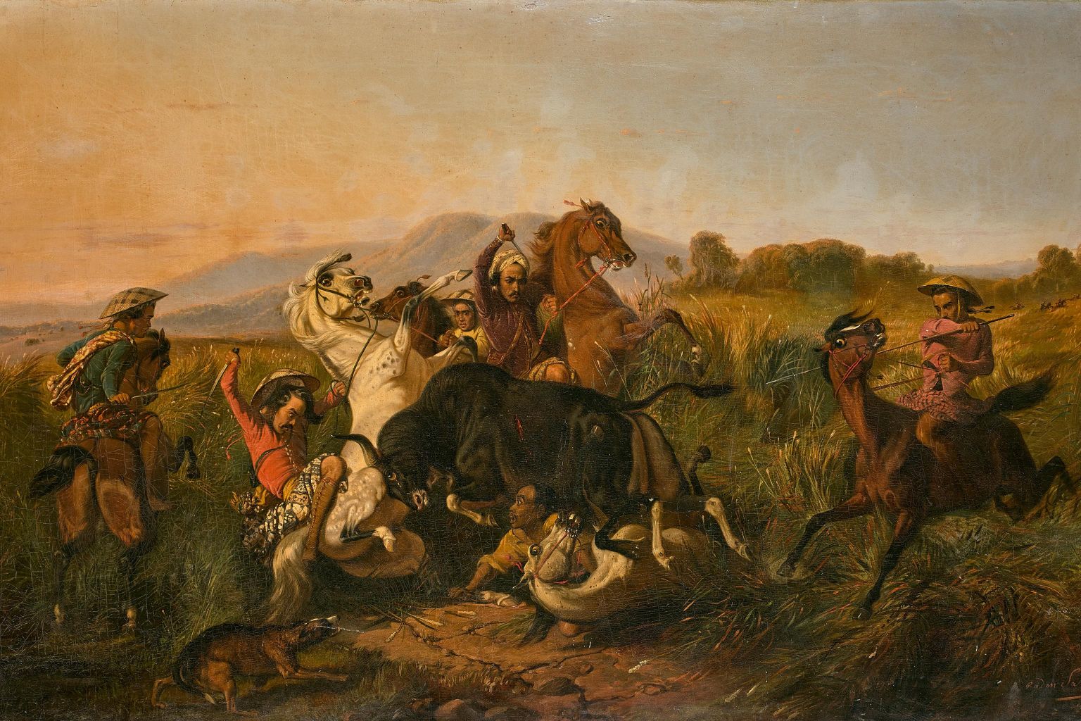 The oil painting in last Saturday's auction, titled La Chasse au Taureau Sauvage (Banteng), or Banteng Hunt, is believed to have been done by Raden in 1855, according to the signature. Like many of his other works, it depicts the hunting of a wild animal - in this case a wild bull in Java, attacked by the painter himself on horseback with others.