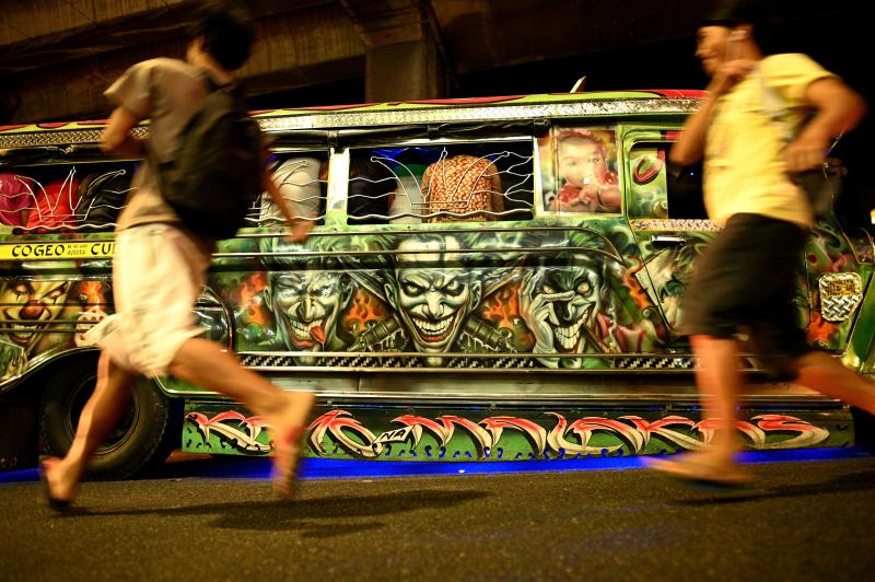 A jeepney with custom artwork on its side during rush hour in Manila on Jan 14, 2019.
