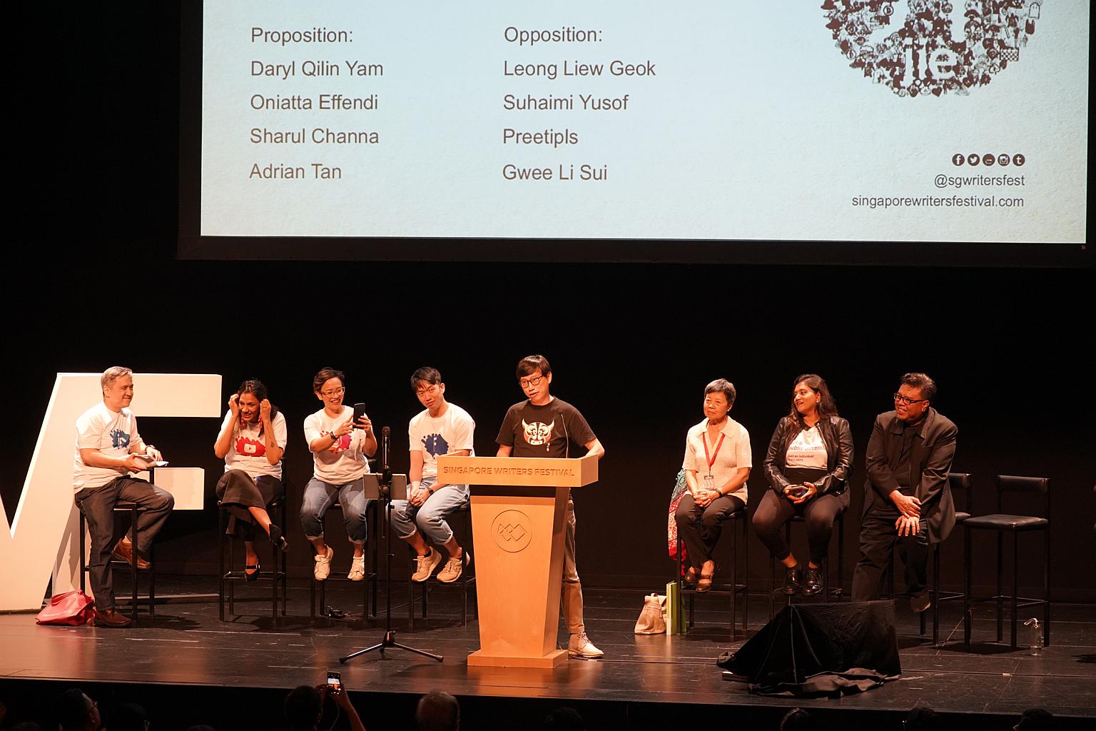 The festival closing debate is usually a raucous affair and this year's edition brought the house down with a slate of writers and comedians that ranged from the millennials - writer Daryl Yam and self-avowed "satirical Internet queen", local YouTuber Preetipls, who was inexplicably on the opposition - to veterans such as poet Leong Liew Geok and lawyer Adrian Tan, famously the author of The Teenage Textbook (1988).