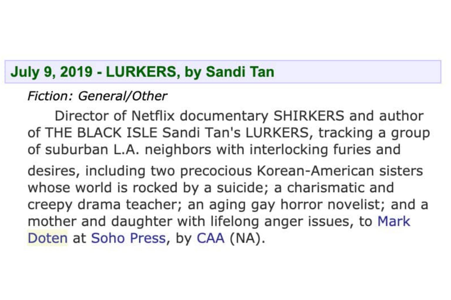 Author Sandi Tan described Lurkers, which is expected to come out late next year (2020) or 2021, as "darkly hilarious" and "somewhat about female anger management".