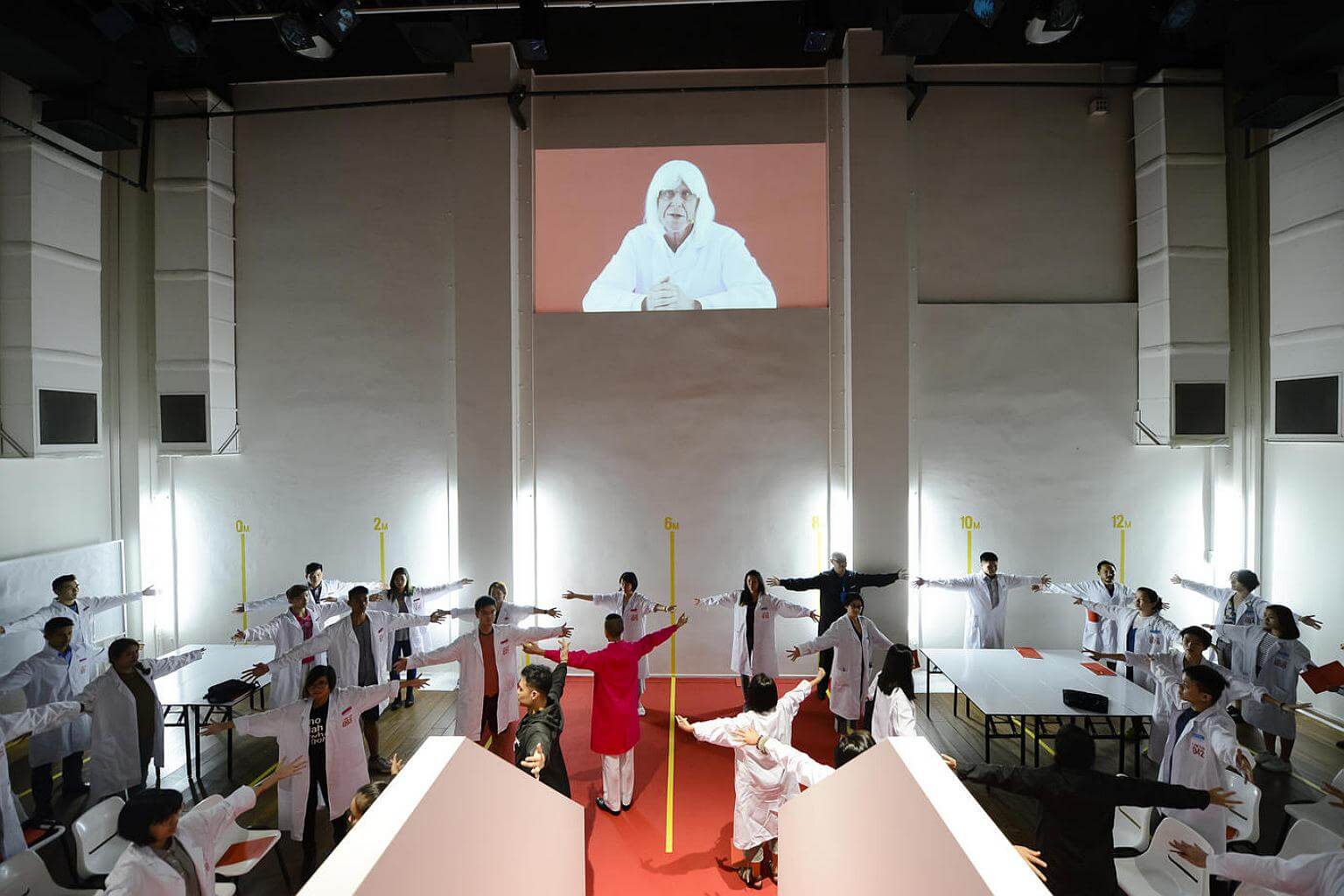 Participants in white lab coats are guided through exercises and tasks by facilitators in coloured lab coats, during the 4 hour participatory piece of performance art I Am LGB.