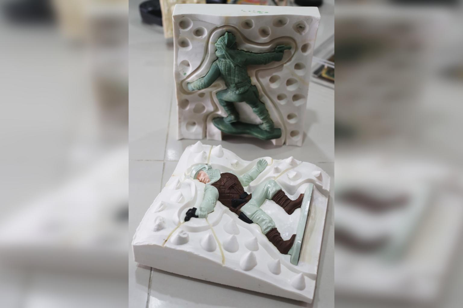 Now-defunct toy company Kenner launched a Micro Collection line in the early 1980s featuring 1.25-inch-tall, non-movable Star Wars characters. Before these toys were mass-produced, the creators came up with prototypes - known as "4-up hard copies" -which were four times the size of the final toys, and sometimes painted. This rare silicone mould was used to produce a resin prototype of Luke Skywalker in a Hoth outfit.