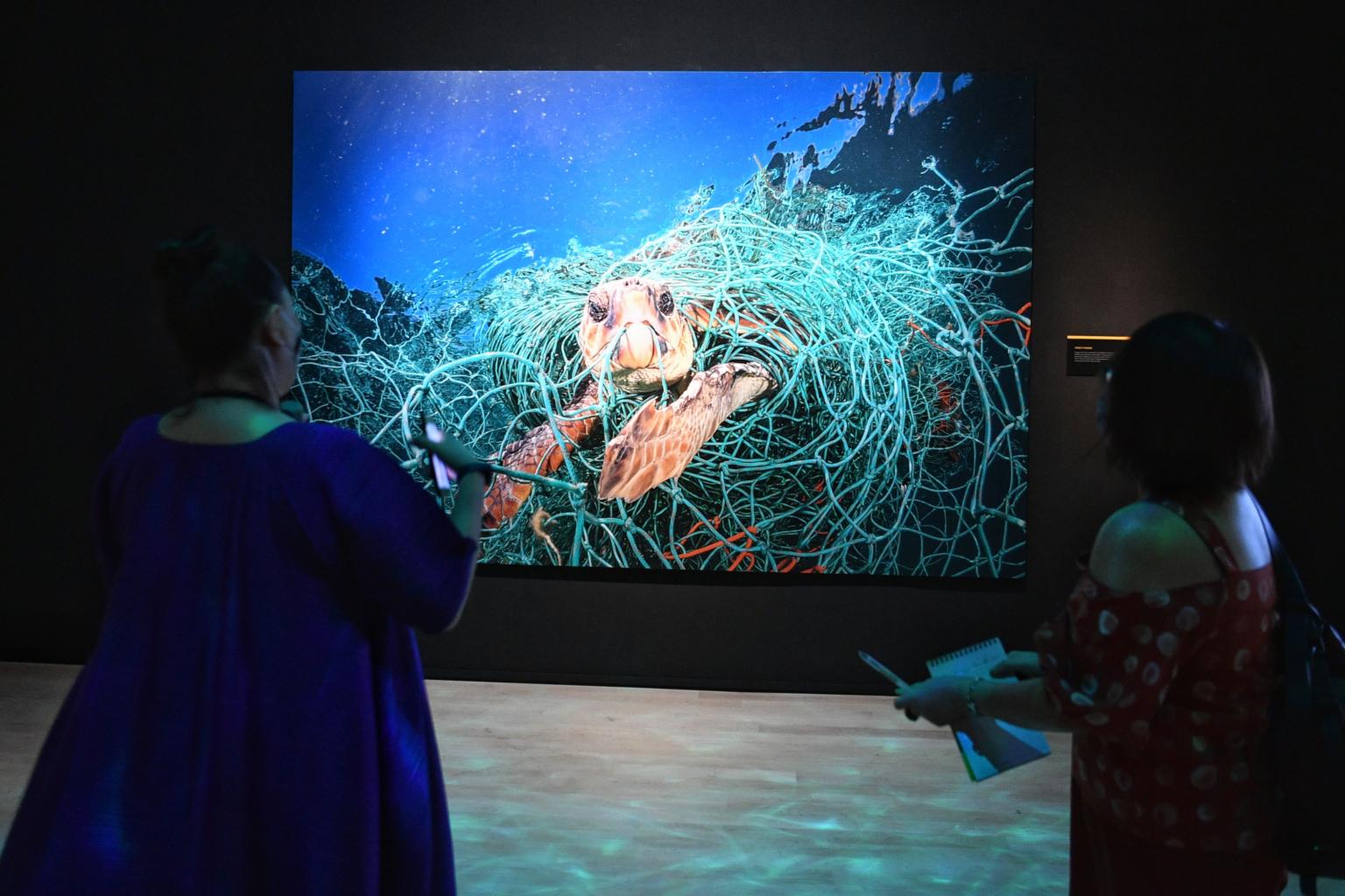 A National Geographic photograph of marine life affected by plastic pollution at the ArtScience Museum’s exhibition.