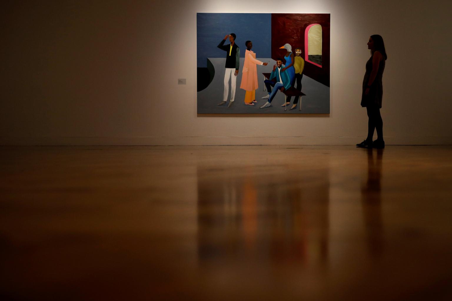 A gallery worker stands next to a painting by Turner Prize nominee Lubaina Himid at the press preview for the 2017 Turner Prize at Ferens Art Gallery in Hull, Britain, on Sept 25, 2017.