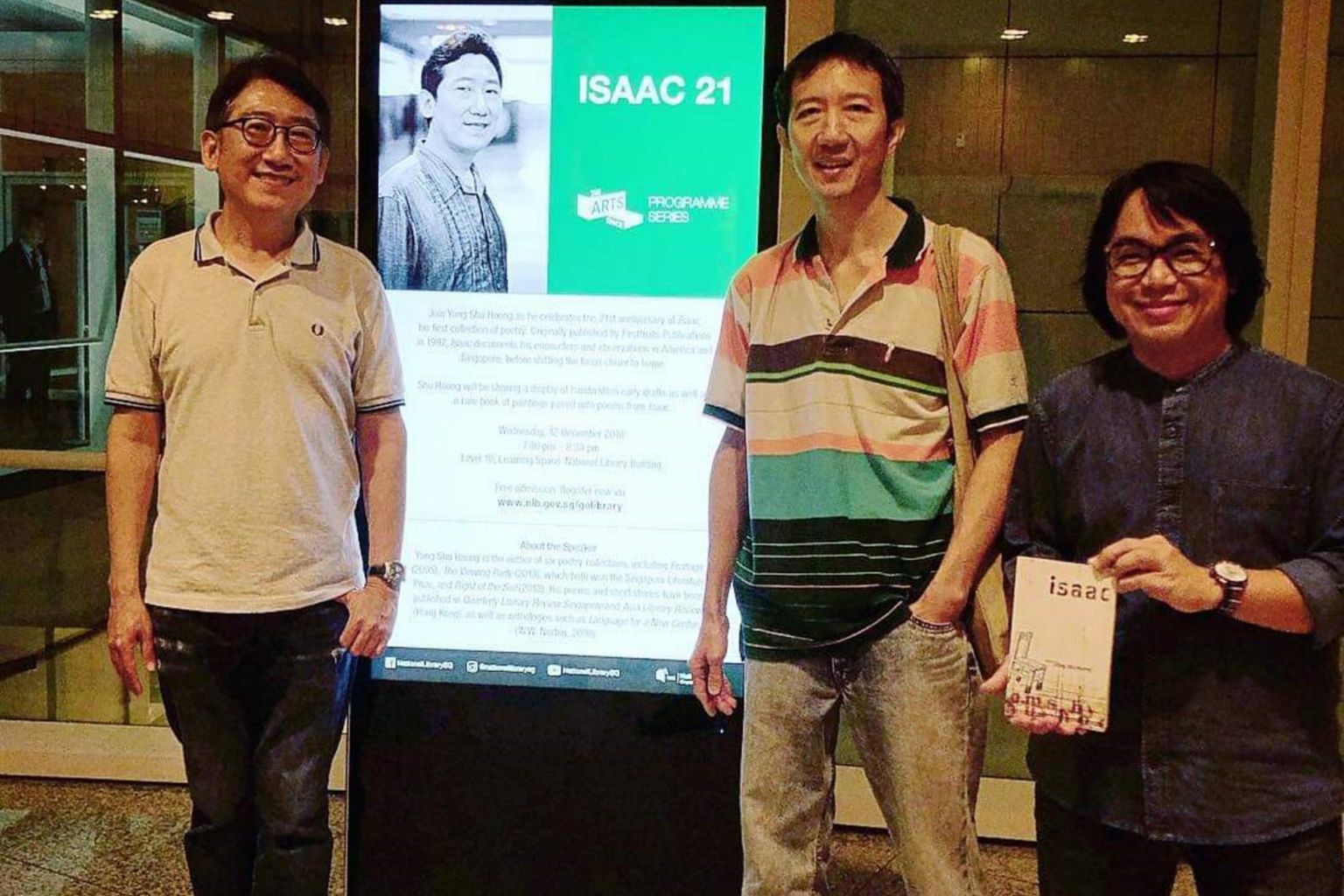 Poet Yong Shu Hoong (left) with publisher Enoch Ng (centre) and designer Little Ong (right) at the event, Isaac 21, where he donated two limited edition books to the library.