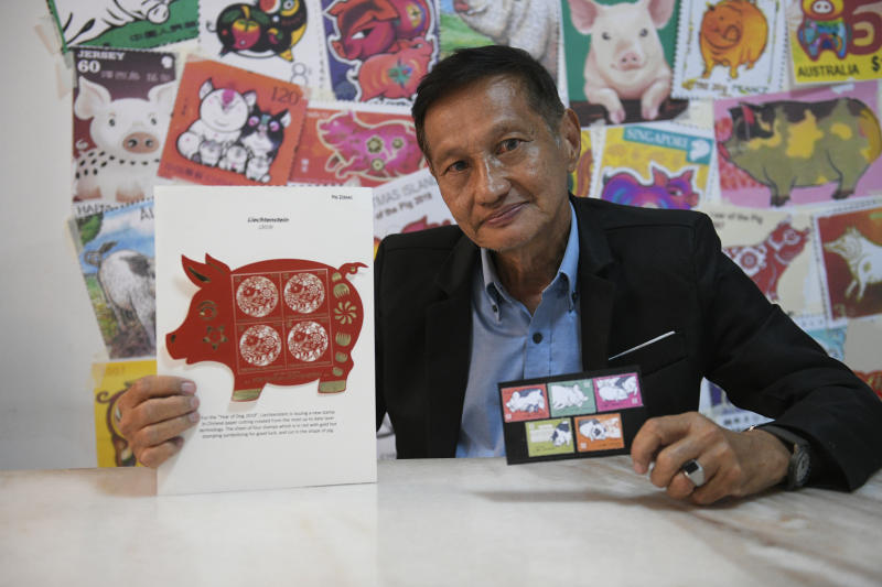 Stamp collector Johnny Lowis poses with his zodiac stamp collection at his house on Jan 30, 2019.