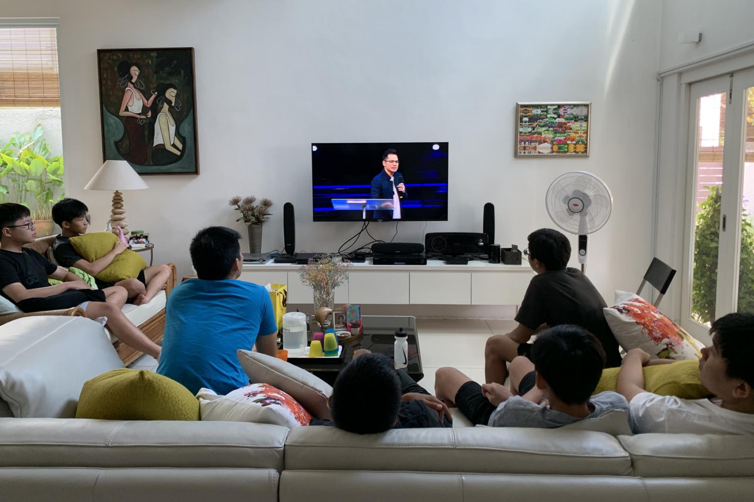 A dozen young adults gather at a smart TV, its size a fraction of their megachurch jumbotron screen, raising hands to songs livestreamed from Faith Community Baptist Church in Marine Parade.
