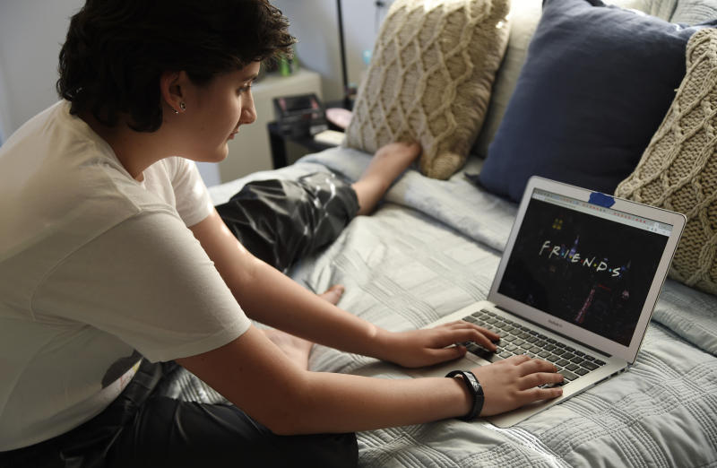 In a photo taken on Aug 22, 2019, 13-year-old Esme Goldman streams an episode of the '90s sitcom "Friends" via Netflix in her bedroom, in Pasadena, California.