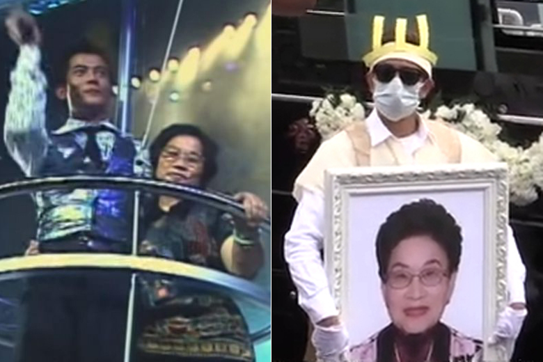 Aaron Kwok and his mother Coek Seon at a 1998 concert (left). Madam Coek died at the age of 90 on Feb 7, 2020.