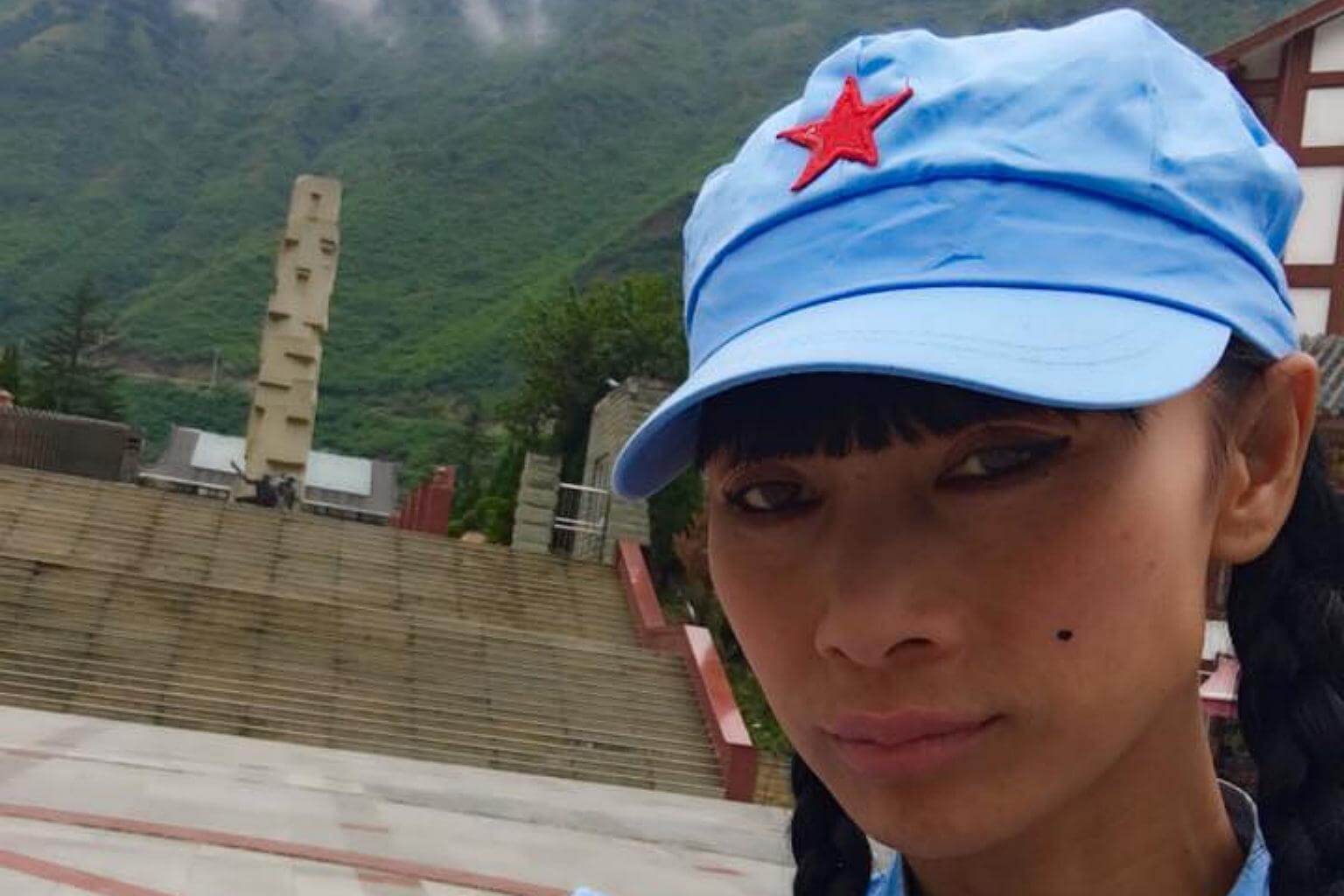 In one photo, she is dressed in a red-and-white sleeveless jumpsuit, leaning seductively in the doorway of Mao Zedong's former residence in Yan'an.