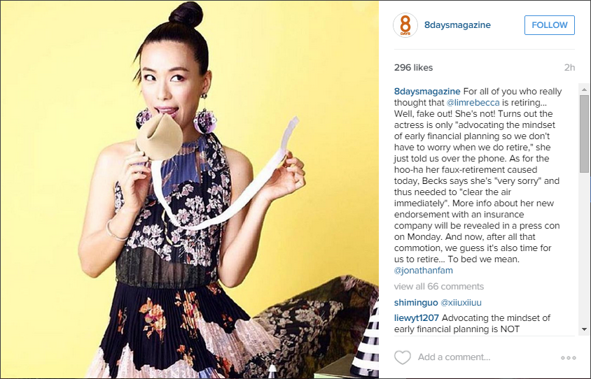 The 29-year-old star clarified in a conference call at about 8.20pm on Friday night (Feb 12) that her Instagram post earlier that day was part of a collaboration with insurance company NTUC Income.