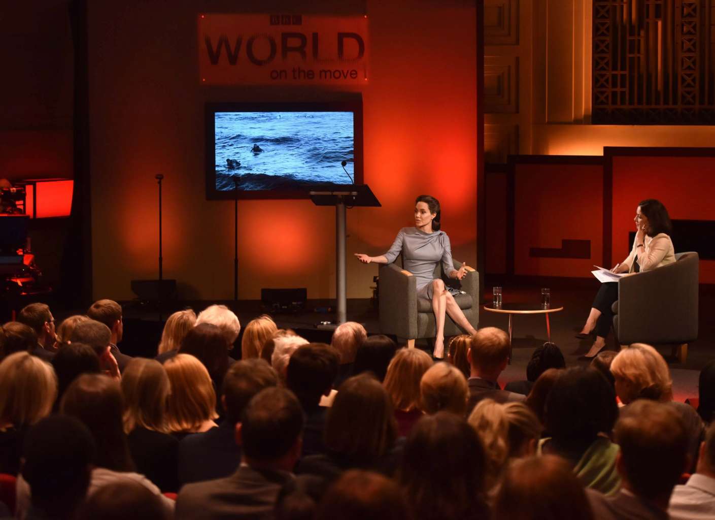 Angelina Jolie-Pitt (centre) speaking in the BBC Radio Theatre in central London.