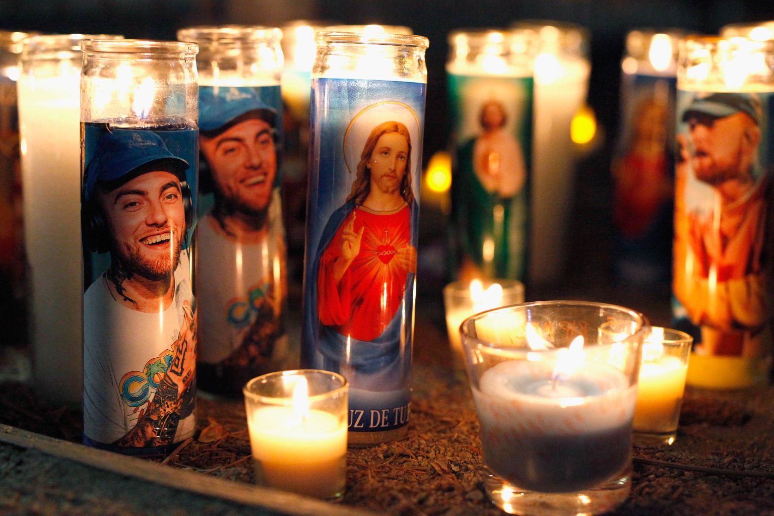 Candles form a memorial to late rapper Mac Miller in Los Angeles, California.