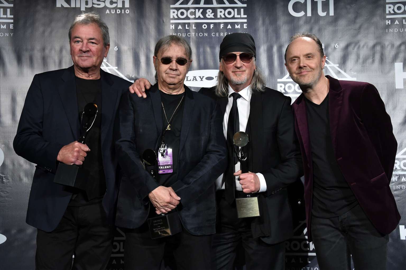 From left to right, Ian Gillan, Ian Paice, and Roger Glover of Deep Purple pose with Lars Ulrich of Metallica at the 31st Annual Rock And Roll Hall Of Fame Induction Ceremony in New York City.