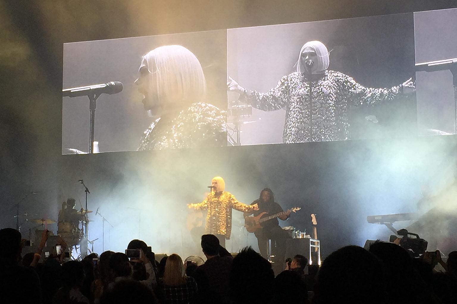 The set-up was minimal with a three-panelled screen showing close-ups of the 28-year-old singer's face, and her band comprising a keyboardist, bassist, acoustic guitarist and drummer.