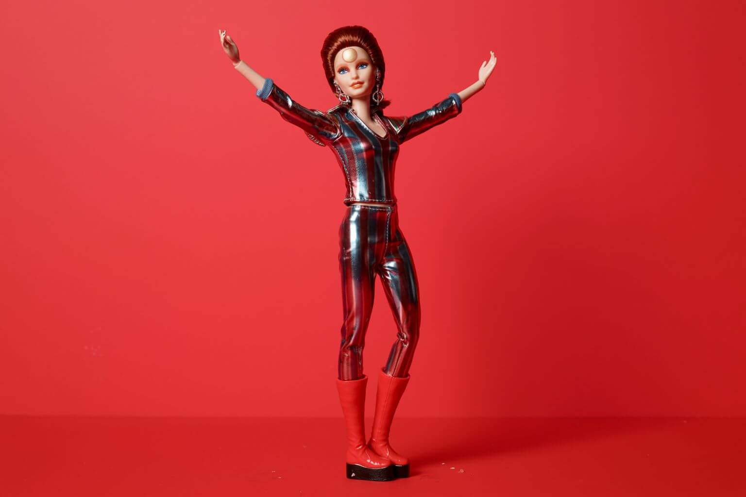 The doll, sporting a striped metallic jumpsuit with matching platform red boots and cosmic accessories, symbolises David Bowie's bisexual alien messenger alter-ego Ziggy Stardust.