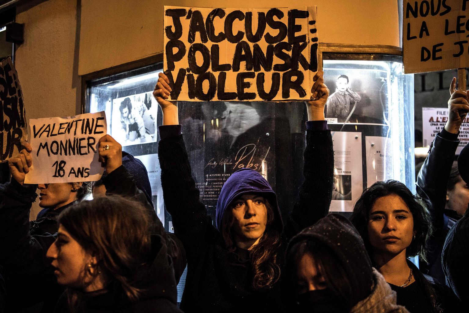 Demonstrators hold banners reading "I accuse: Polanski Rapist" during a protest outside the "Champo" cinema hall in Paris.