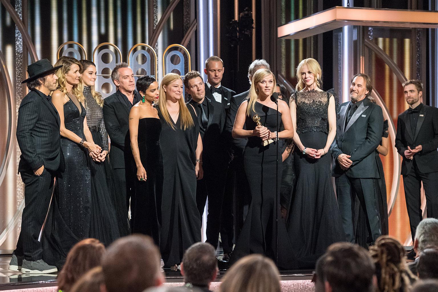 Reese Witherspoon (centre) accepting the Golden Globe award for Best Television Limited Series or Motion Picture Made for Television for Big Little Lies with cast and crew members.