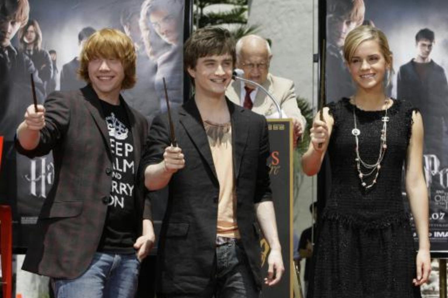 The main stars of the Harry Potter films holding their magic wands during a hand and foot print ceremony in the forecourt of Graumans Chinese Theatre in the Hollywood section of Los Angeles.