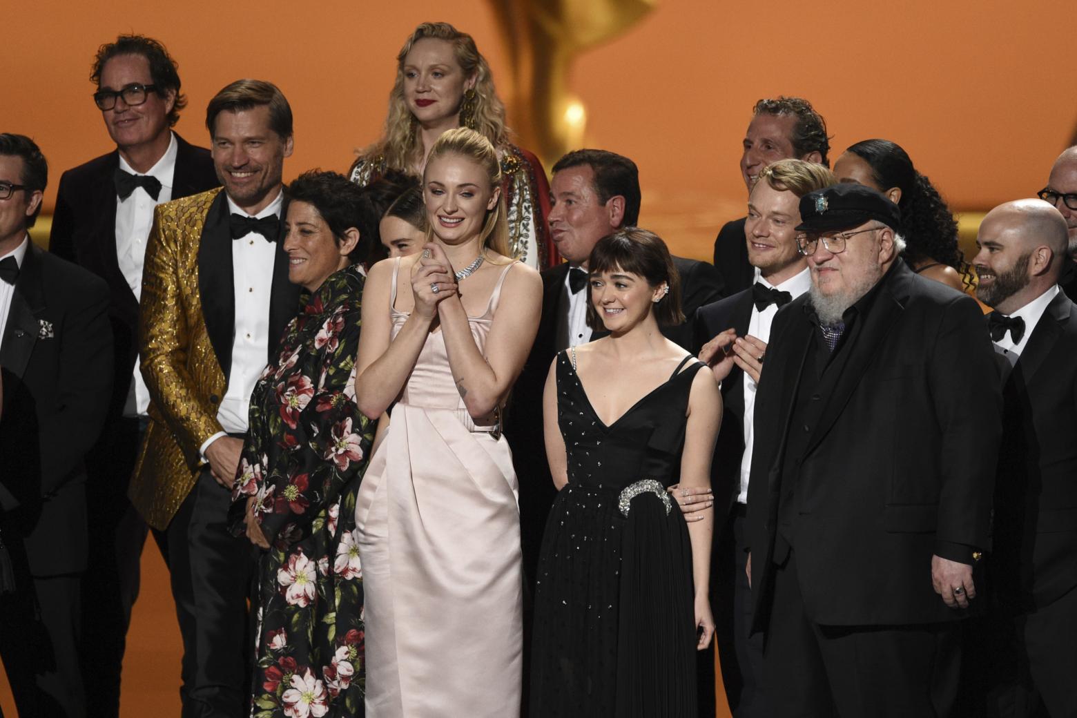 Members of the cast, dressed in their modern-day finest, gathered onstage to bid adieu to the show that made many of them household names. While none of the women of the series won any acting awards in the show's eight-season run, they received loud cheers during the segment. Fan favourite Gwendoline Christie looked overwhelmed.