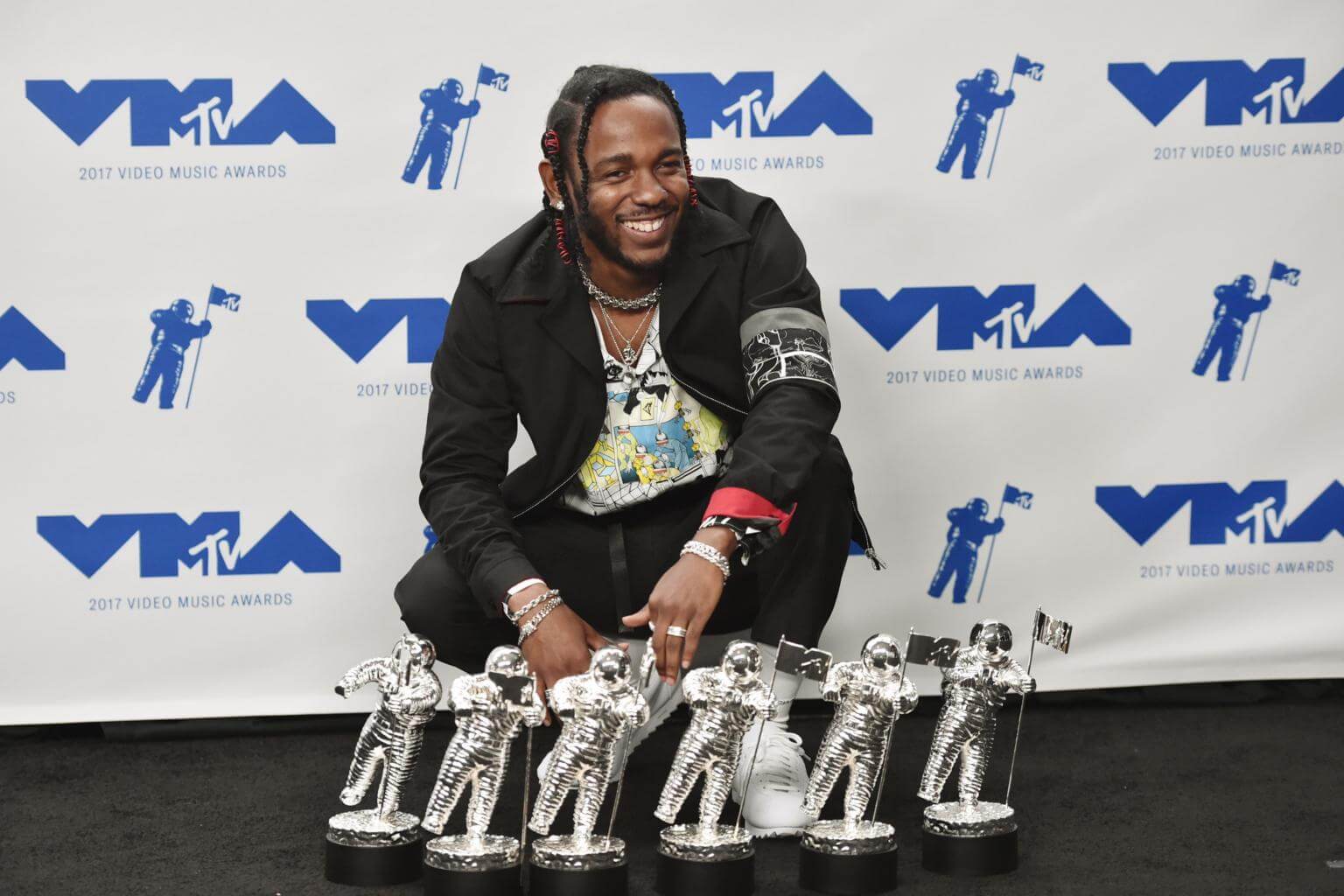 Rapper Kendrick Lamar poses in the press room during the 2017 MTV Video Music Awards on Aug 27, 2017.