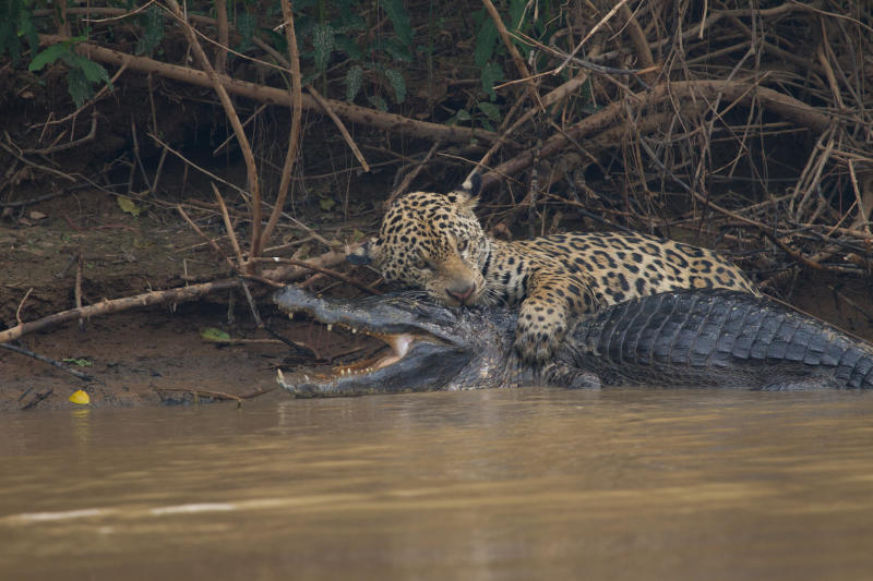 A jaguar hunting a crocodile on the river banks in the Pantanal in Brazil.