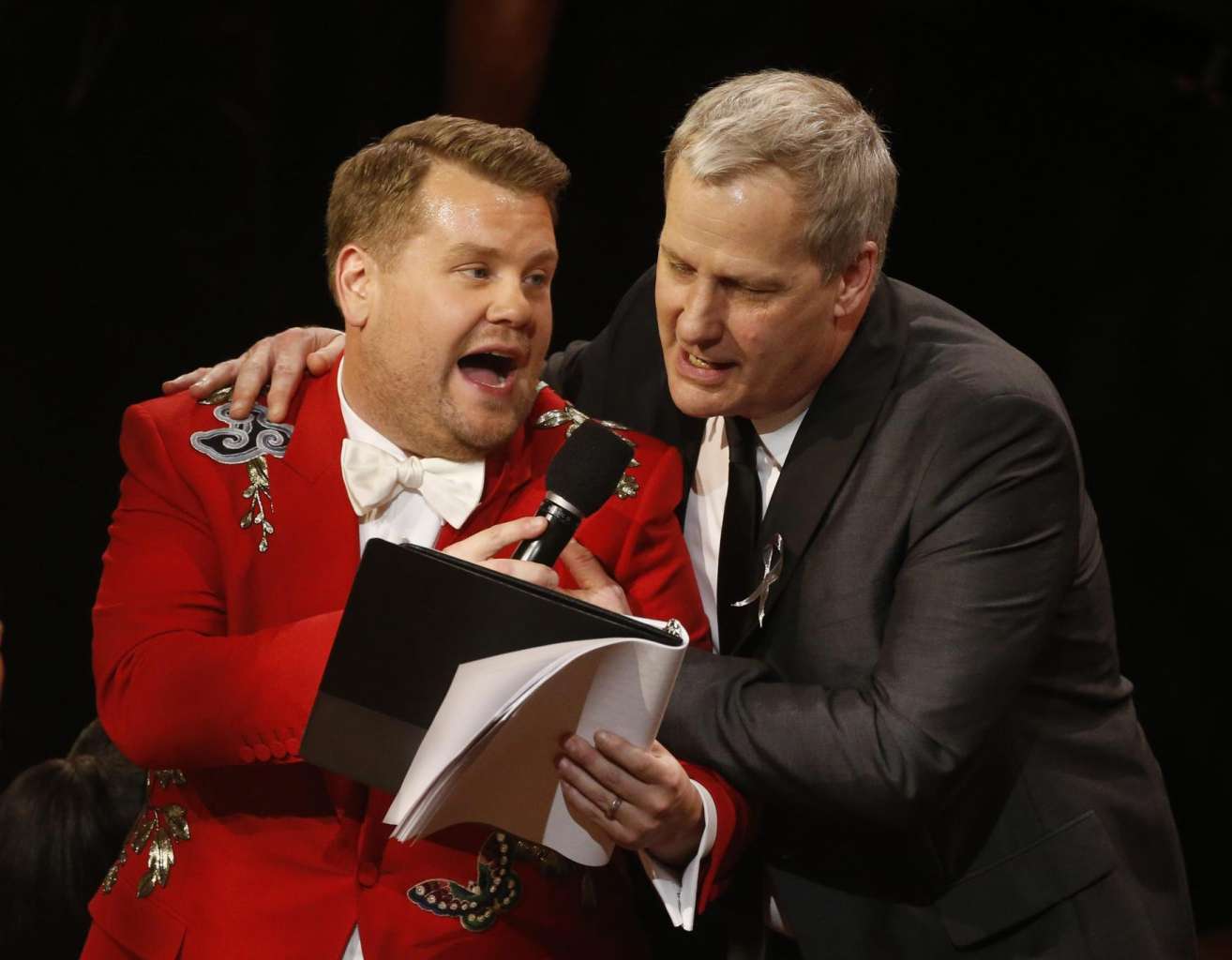 Actor Jeff Daniels (right) performs with show host James Corden during the Tony Awards.
