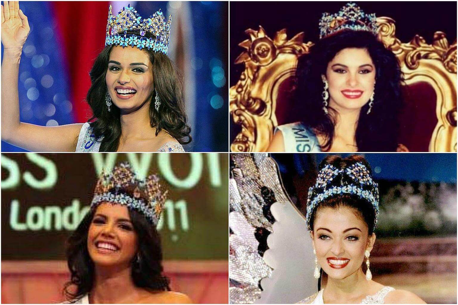 (Clockwise from top left) Manushi Chhillar, Ninibeth Leal, Aishwarya Rai, Ivian Sarcos.