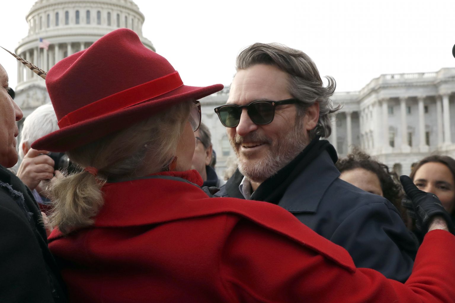 Actress and activist Jane Fonda hugs actor Joaquin Phoenix outside the US Capitol.