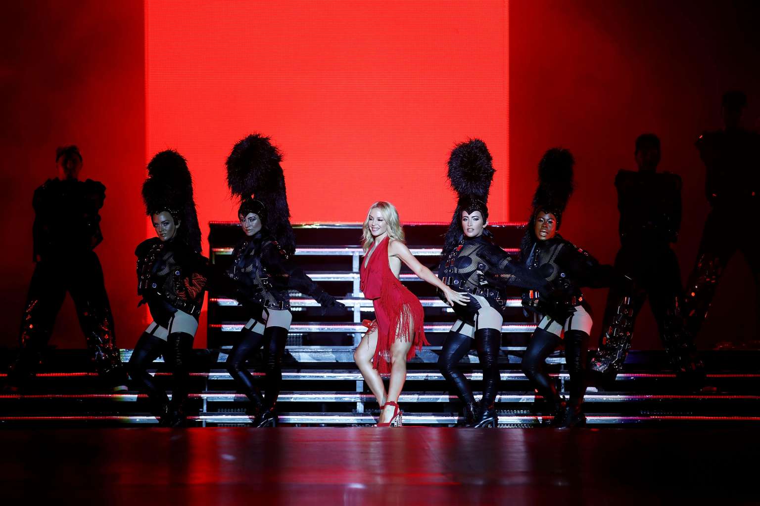 Minogue herself sported an elaborate fascinator and thigh-high boots as she belted out the club classic Spinning Around and an impassioned Your Disco Needs You, which was filled with high notes. She would go on to change her costume three times throughout the night.